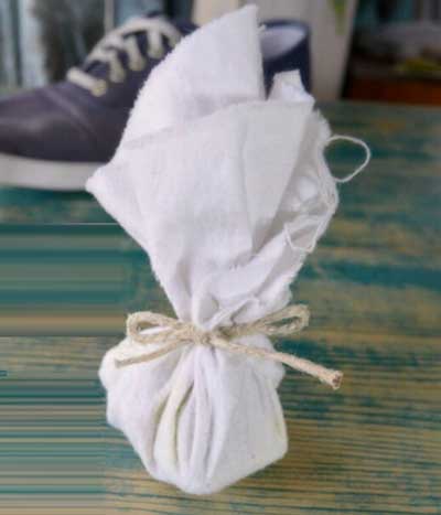 你的活性炭已經(jīng)填裝到咖啡過濾紙上了,精油也滴上去了。現(xiàn)在只要盡可能緊地包裹過濾紙,同時將角落塞入以防止活性炭泄漏。如果您想要格外謹(jǐn)慎,可以使用一小塊膠帶密封好,并在下一步中保持開啟狀態(tài)。