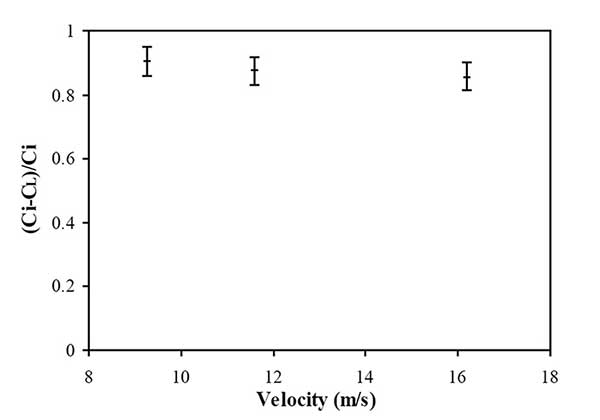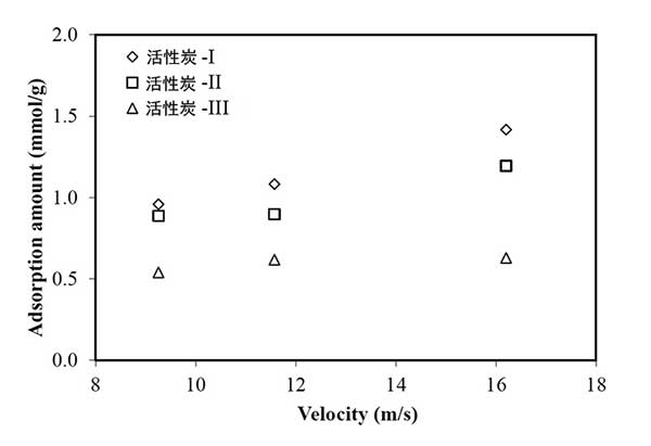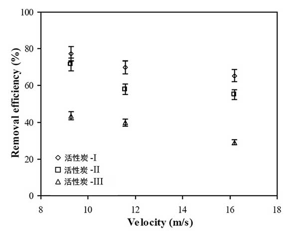 流速同時(shí)影響氣體吸附和活性炭回收,因?yàn)樗婕皻怏w和活性炭顆粒的混合程度、。圖3在各種活性炭吸附劑尺寸下,氣體去除效率和流量之間呈現(xiàn)出輕微的反比關(guān)系。最小的吸附劑(活性炭-1)以9.26米/秒除去77.4%的甲苯蒸氣,然后以16.2米/秒降至65.4%。微粒活性炭吸附劑捕獲沿著旋風(fēng)分離器的流動(dòng)路徑行進(jìn)的甲苯蒸氣。雖然在前面的的內(nèi)容說(shuō)過吸附量以高速增加,但是氣體去除效率相當(dāng)?shù)。這是因?yàn)樵诟吡髁肯录妆降慕^對(duì)體積要高得多。因此,即使活性炭吸附得更多,更多的氣體分子傾向于流出而沒有在內(nèi)部吸收。因此,關(guān)于顆;厥蘸蜌怏w去除效率的最佳流量必須通過在各種操作條件下的眾多實(shí)驗(yàn)來(lái)確定。