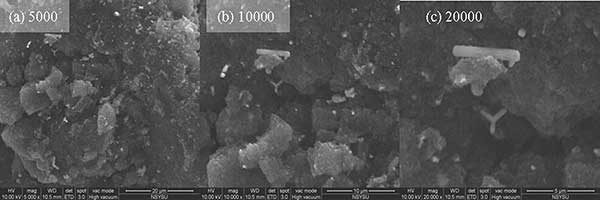 硫浸漬活性炭由大量微孔組成,高硫含量增強(qiáng)了活性炭對(duì)氯化汞的吸附能力。微孔通常具有大部分HgCl2吸附的活性位點(diǎn),而大孔和中孔作為運(yùn)輸路線。圖21顯示了分別放大5000,10,000和20,000倍的硫浸漬活性炭的ESEM圖像。如圖1所示,主要在活性炭表面發(fā)現(xiàn)大于500的大孔,中孔和微孔隱藏在活性炭?jī)?nèi)部。在硫浸漬之后,硫分子可以擴(kuò)散并沉積在活性炭的微孔上,并且可能堵塞過渡路徑。