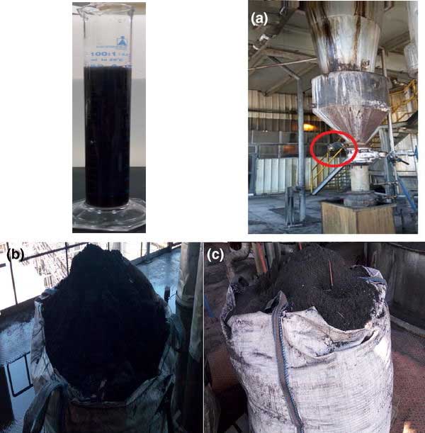 圖1:糖汁深色液體,旋風分離器球閥活性炭收集器(a),活性炭(b,c)。