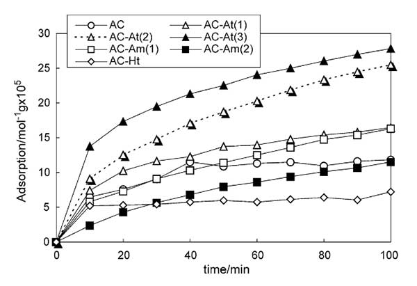 實(shí)驗(yàn)中的活性炭具備高度微孔并且有高達(dá)2600m 2 / g的高BET比表面積。在酸處理的活性炭的情況下,BET比表面積隨著H2SO4在HNO3/H2SO4溶液中的比率而降低。假定活性炭的碳多孔結(jié)構(gòu)被HNO3/H2SO4溶液的強(qiáng)氧化作用破壞,并且未檢測到微孔。另一方面,由于十六胺的吸附,活性碳的十六烷胺處理大大降低了BET比表面積。通過滴定法估算的活性炭上的酸性基團(tuán)的量。用HNO3/H2SO4溶液處理碳表面產(chǎn)生大量酸性基團(tuán),在HNO3/H2SO4溶液中隨著H2SO4比例的增加,酸性基團(tuán)的量增加。AC-At(3)的每單位表面積的酸性基團(tuán)比未處理的活性炭高約10倍。據(jù)推測,加入H2SO4會(huì)增強(qiáng)活性炭的氧化效果。另一方面,活性炭中酸性基團(tuán)的量隨著Ar中的熱處理而降低;钚蕴康奶急砻嫔系乃嵝曰鶊F(tuán)應(yīng)該在高溫下在惰性氣體中分解。通過元素分析估算的活性炭上吸附的十六烷胺的量隨著水溶液中十六烷胺濃度的增加而增加。圖2顯示甲基硫醇在活性炭上的吸附作為時(shí)間的函數(shù)。吸附在原始活性炭和熱處理活性炭上的甲硫醇的量在初始時(shí)間隨時(shí)間增加并達(dá)到平穩(wěn)值。甲基硫醇在熱處理活性炭上的吸附量低于活性炭。甲硫醇在物理上例如通過分散力吸附在熱處理過的活性炭表面上。另一方面,吸附在酸處理的活性炭和十六烷基胺吸附的活性炭上的甲硫醇的量隨時(shí)間增加。在酸處理的活性炭的情況下,在用于處理的HNO3/H2SO4溶液中,隨著濃度的H2SO4,甲硫醇的吸附增加。由于在HNO3/H2SO4溶液中活性炭的酸性基團(tuán)的量隨著H2SO4的濃度而增加,甲硫醇的吸附量應(yīng)該受到酸性基團(tuán)的影響。