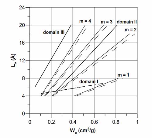 活性炭孔隙率遵循三個線性結(jié)構(gòu)域所示的常見趨勢。這一事實表明存在著由不同前體和精制路線的固體部分共同形成的共同形態(tài)。根據(jù)這些多孔固體的近期和各種已發(fā)表的特征,它們的孔壁由基本結(jié)構(gòu)單元的空間排列構(gòu)成,所述基本結(jié)構(gòu)單元由層疊的石墨烯層組成。為了減少模型中的參數(shù)數(shù)量,結(jié)構(gòu)被描述為圓盤狀顆粒,其直徑的特征在于石墨烯層中涉及的苯環(huán)的數(shù)量,并且其厚度由堆疊層的數(shù)量和層間距離。用于工業(yè)宏觀尺寸盤狀顆粒堆積的可用經(jīng)驗相關(guān)性已經(jīng)應(yīng)用于那些納米級結(jié)構(gòu),導(dǎo)致在chars和碳分子篩觀察到的實驗微孔體積范圍內(nèi)的值。