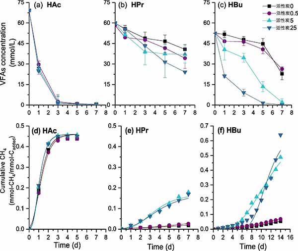 計(jì)算每種VFA物種的降解動(dòng)力學(xué)(k)并呈現(xiàn)在表1中;旧,R2高,特別是在低活性炭劑量時(shí),僅HBu(5.0g/L)的R2低于其他。其原因可能是由于抑制作用,導(dǎo)致S形功能的偏離。以5g/L的丙酸鹽作為底物時(shí),消化器中的k值增加約1.5倍,即當(dāng)活性炭劑量從0增加到25g/L時(shí),從0.0022增加到0.0056h-1。對(duì)丁酸酯降解的刺激作用更顯著,其動(dòng)力學(xué)值增加7.1倍,即從0.0043至0.0306h-1當(dāng)活性炭劑量從0增加到25g/L時(shí)。上述結(jié)果清楚地表明補(bǔ)充活性炭可以劑量依賴性的方式促進(jìn)丙酸和丁酸的甲烷生成。值得注意的是,雖然丙酸和丁酸的降解速度通過補(bǔ)充活性炭而顯著增加,但它們的速率仍低于乙酸鹽的速率,范圍為0.0386-0.0431 h-1。這些結(jié)果進(jìn)一步證實(shí)了丙酸和丁酸轉(zhuǎn)化的困難,以及進(jìn)一步探索促進(jìn)機(jī)制的重要性。
