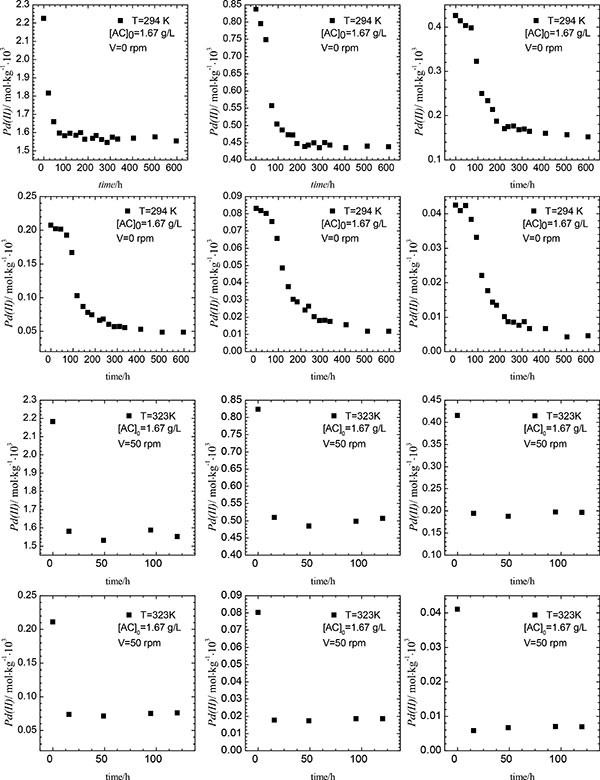 圖1:氯化鈀復合離子初始濃度的初始濃度對活性炭吸附影響。實驗條件:pH1,Cl-=0.1mol·kg-1。