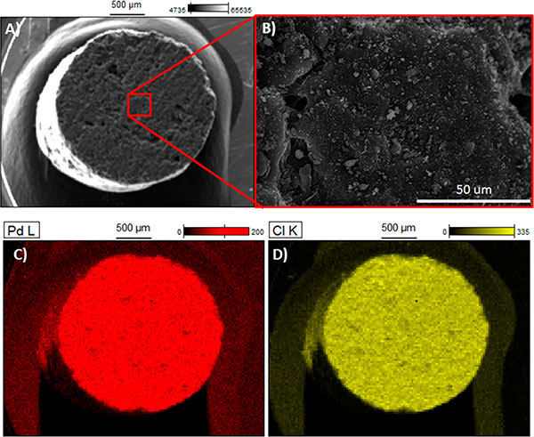圖3:(A)活性炭的SEM分析,(B)選擇區(qū)域的放大率,(C和D)吸附氯化鈀(II)絡合離子后的EDS截面分析。