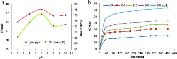 圖4、pH值(a)在濃度=50 mg/L和接觸時(shí)間(b)對(duì)濃度=50-300 mg/L的影響,苯胺吸附在活性炭上,W=1 g/L T=20℃。