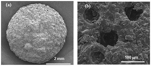 圖1.(a)珠粒尺寸和(b)活性炭明膠復(fù)合材料外表面的SEM照片。