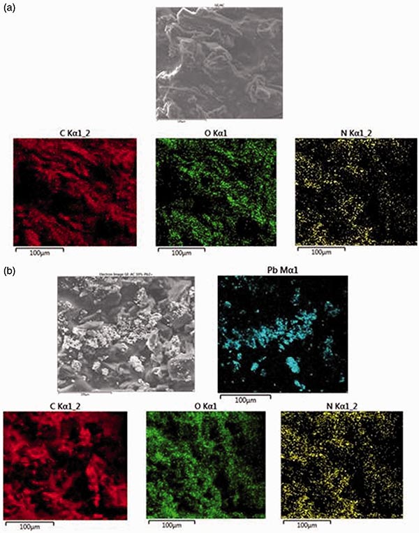 圖2.吸附鉛離子之前和(b)活性炭明膠復(fù)合材料吸附之后(a)的EDX點(diǎn)映射。