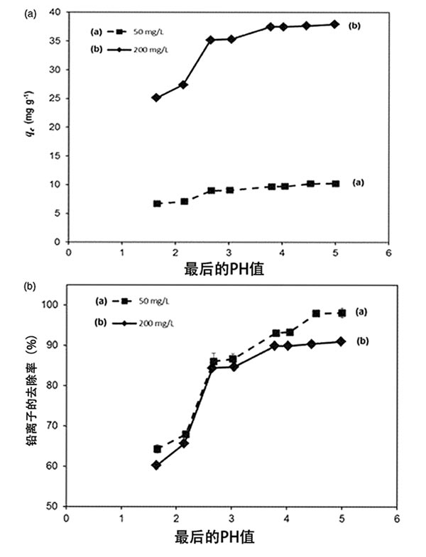 圖3.pH對(duì)活性炭明膠復(fù)合材料對(duì)鉛離子吸附的影響;钚蕴棵髂z復(fù)合材料劑量0.15g/50ml,溫度23±2℃,鉛濃度(a)50mgl-1和(b)200mgl-1。