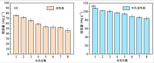 為了比較水洗再生對脫硫后活性炭樣品的影響,研究了硫容量與活性炭和中孔活性炭的循環(huán)次數(shù),如圖3所示。活性炭的工作硫容量總體呈下降趨勢,第一次脫硫時為75.6 mg·g-1,第8次循環(huán)為46.2 mg·g-1,減少率為40.5%,如下圖所示。圖3a。結(jié)果表明,飽和吸附劑對H 2 SO 4的不完全解吸對循環(huán)SO 2有明顯的負面影響活性炭的吸附性能。用中孔活性炭觀察到類似的結(jié)果。然而,中孔活性炭的硫容量在8個循環(huán)后降低了22.0%,遠低于微孔活性炭的降低速率,這表明互連微孔和有序介孔的特性促進了H的解吸。2 SO 4并減少硫容量的減少。