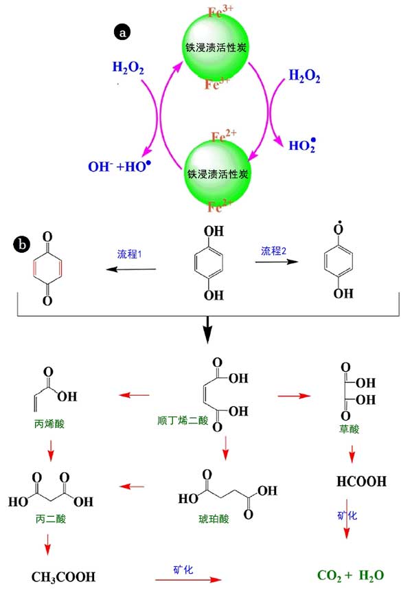 各種類型如羥基(HO•)和過氧羥基(HOO•)自由基的從而起到在苯二酚的氧化重要作用是由各種鐵化合價(jià)的氧化-還原反應(yīng)生成的鐵(Fe(III)/Fe的(II))存在于的鐵浸漬活性炭催化劑在過氧化氫的存在下進(jìn)行。氧化反應(yīng)得到由形成絡(luò)合物開始Fe(III)的-OH基團(tuán)。代在表示這些基團(tuán)的機(jī)制圖2(a)中。這些自由基氧化苯二酚(ⅰ)吸附在催化劑,(ⅱ)存在于催化劑的附近和(iii)在本體溶液中。的苯二酚氧化機(jī)理示于圖2(b)中。苯二酚在其氧化形式各種中間體取決于氧化的階段。它形成的中間體,在此期間被氧化成羧酸,如馬來酸,草酸,丙烯酸,琥珀酸,丙二酸,乙酸和氧化的后面酸氧化的初期階段,例如苯醌和CO 2和H 2 O的充分氧化。
