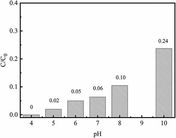 初始pH對(duì)鉻酸鹽去除能力的影響如圖3所示。發(fā)現(xiàn)鉻酸鹽的去除能力明顯受pH值在4.0-10.0范圍內(nèi)的影響。隨著溶液pH從4增加到10,鉻酸鹽去除率從100%下降到76%。在pH~4.0時(shí),HCrO 4是鉻酸鹽的主要形式。因此,在高溶液的pH值,使Cr之間的強(qiáng)烈競(jìng)爭(zhēng)羥基(OH)應(yīng)該是低鉻酸鹽去除能力的主要原因。此外,較低的pH可有助于去除無(wú)源氧化鐵層,活性炭復(fù)合材料的表面中含有納米零價(jià)鐵用于接觸周?chē)腃r(vi)溶液。因此,在所有后續(xù)的程序?qū)r溶液的初始pH設(shè)定為4.0。
