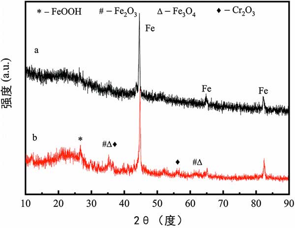 在該研究中,應(yīng)用XRD分析鉻酸鹽溶液處理后的活性炭以揭示其機(jī)制。在與鉻酸鹽溶液反應(yīng)2小時(shí)后,活性炭的XRD圖譜沒(méi)有顯著改變(圖4)。然而,與新制備的活性炭相比,可以清楚地檢測(cè)到氧化鐵晶相。XRD結(jié)果表明,而在去除鉻酸鹽期間,活性炭搭載的納米零價(jià)鐵可以被氧化成Fe(ii)和Fe(iii)化合物。