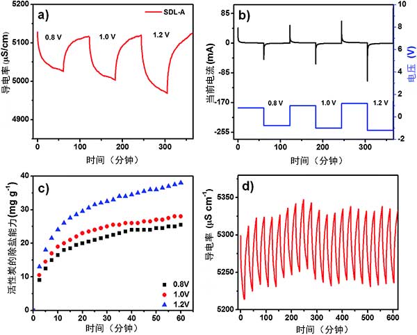 在充電步驟期間,在兩個電極上向膜電容去離子施加正電勢,以從已知NaCl濃度的溶液中吸附離子,并施加負電位以使電極放電并排出廢物流中的離子。圖4a顯示了在NaCl溶液中0.8V至1.2V的各種電位下,活性炭在初始濃度2500mg L-1下的脫鹽性能。在所有施加的電位中,在充電期間首先觀察到溶液電導率的急劇下降,并且當吸附接近平衡時,電導率的變化減小直至達到平臺。圖4b示出了具有增加電勢的正相關電流瞬變,而圖4c顯示了活性炭電極在不同施加電位下的鹽吸附容量。從0.8V到1.2V,鹽吸附容量從23增加到38mg g-1,表明更高的電池電位可以提高電吸附能力。觀察到的現象可歸因于強靜電力的存在以及在增加的電壓下形成較厚的雙電層。圖4d示出了活性炭電極的循環(huán)穩(wěn)定性,在2500mg L-1的NaCl溶液超過20次充放電循環(huán)而沒有去除能力任何明顯的損失。該結果證實了使用活性炭當電極可以再生和重復使用而沒有任何損耗,活性炭是成為用于膜電容去離子應用的電極材料的好材料。