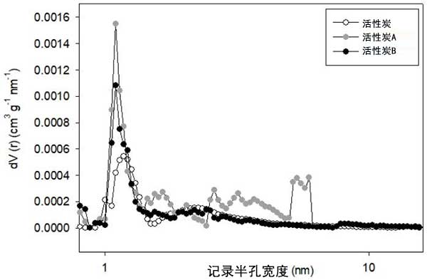 可以觀(guān)察到,由于在解吸分支中形成的小磁滯回線(xiàn),活性炭普遍具有微孔性,這表明毛細(xì)孔凝結(jié)很小,因此中孔的量較少。通過(guò)QSDFT方法獲得這幾種活性炭的總體積和孔徑分布,假設(shè)孔為狹縫圓柱形。圖2顯示了三種研究的活性炭的孔徑分布,可以確認(rèn),對(duì)于所有活性炭樣品,主要存在于1.0-1.5nm區(qū)域的微孔,而對(duì)于活性炭A,也可以檢測(cè)到少量的中孔。