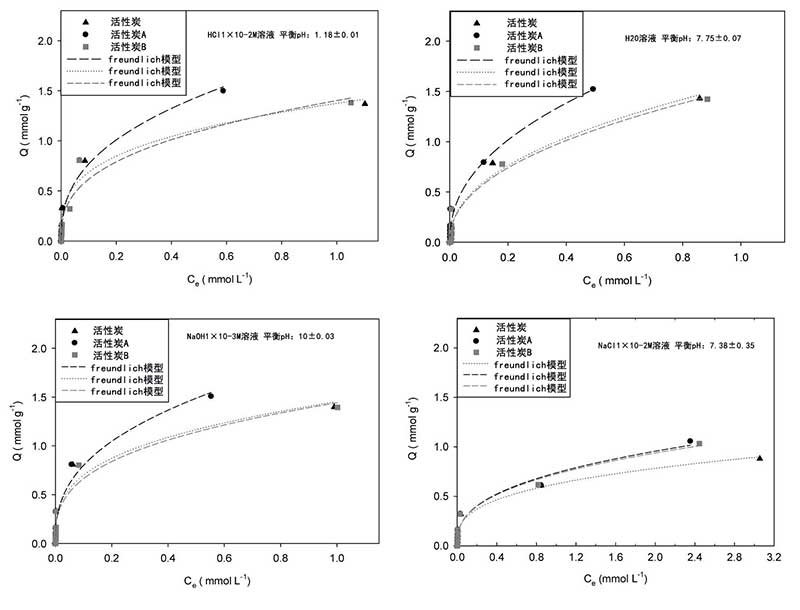 從圖3可以看出,在所有測(cè)試的實(shí)驗(yàn)條件下,當(dāng)平衡濃度較低(即<0.1mmol L-1)時(shí),對(duì)羥基苯甲酸甲酯吸附量的差異三種活性炭最小,而對(duì)于較高的平衡濃度,活性炭A表現(xiàn)出最高的性能,活性炭和活性炭B具有相似的行為,除非離子強(qiáng)度發(fā)生變化。事實(shí)上,在后一種情況下,熱處理樣品顯示出最佳性能并且?guī)缀跸嗨啤榱嗽敿?xì)分析檢索到的結(jié)果,需要進(jìn)一步調(diào)查,建模分析可能會(huì)有所幫助。