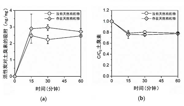 圖1:(a)吸附的土臭素的量和(b)在沒有和存在天然有機物質(zhì)的情況下活性炭上殘留的土臭素的比例。