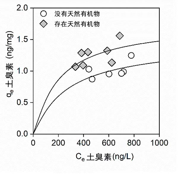 吸附平衡實驗進(jìn)行60分鐘,這足以根據(jù)動力學(xué)研究達(dá)到吸附平衡。圖3顯示了在不存在和存在天然有機物質(zhì)的情況下土臭素在活性炭上的吸附等溫線。如圖2所示,在天然有機物質(zhì)存在下,吸附的土臭素的總量增加。這些結(jié)果意味著天然有機物質(zhì)可以增加活性炭的吸附位點。帶負(fù)電荷的天然有機物質(zhì)增加,因為電排斥力,從而增加了活性炭吸附能力。
