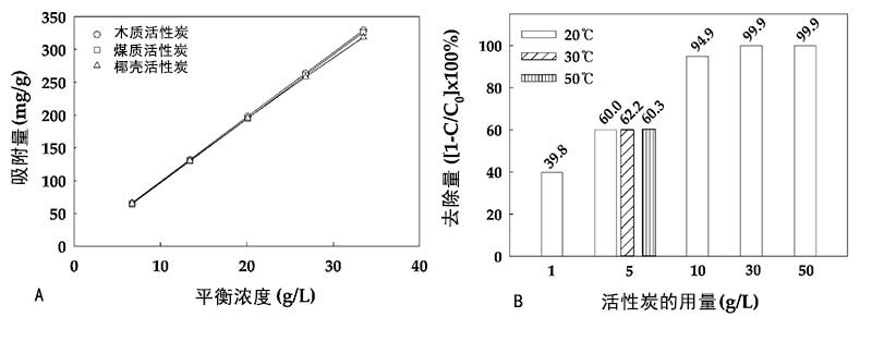 圖3:(A)作為平衡濃度的吸附量取決于不同類(lèi)型的活性炭,(B)活性炭的含量對(duì)去除效率的影響。