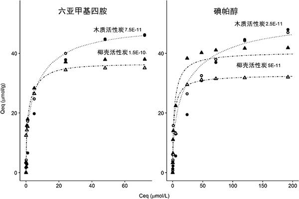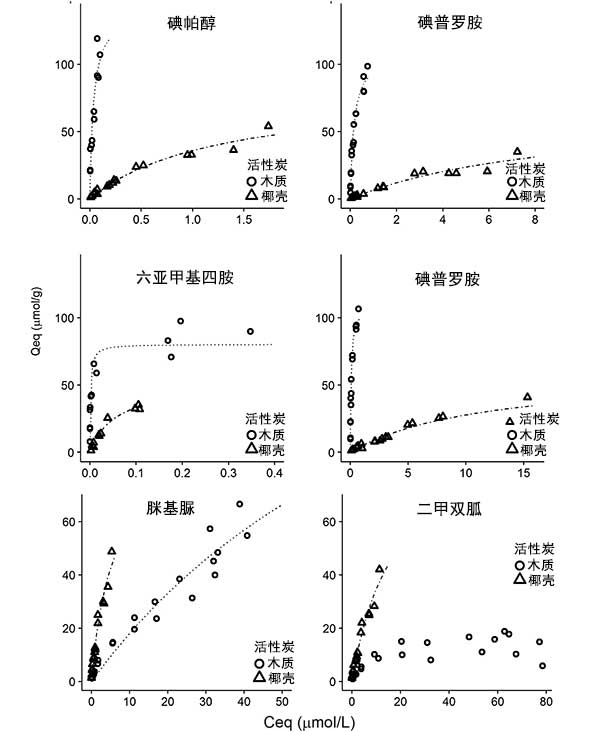 圖1:活性炭對(duì)幾種親水微污染物的吸附等溫線。
