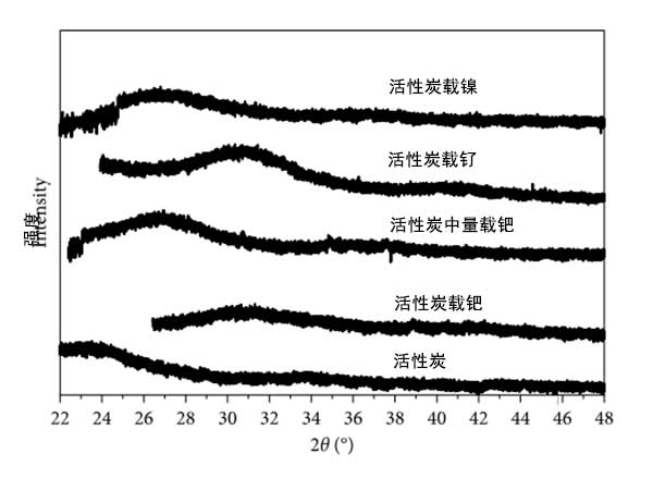 活性炭載三種金屬的衍射圖如圖2所示。在該圖中,可以看出金屬樣品或活性炭沒有確定的信號,這可能表明所有樣品中都沒有結(jié)晶相,或晶體非常小(<100)。不存在結(jié)晶是由于樣品的低金屬負載量低于X射線衍射設(shè)備的檢測極限的結(jié)果。