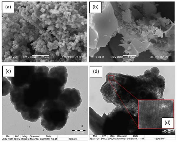 使用SEM,TEM,TGA和XRD分析活性炭的表面形態(tài),熱性質(zhì)和結(jié)晶度。用作活性炭前體的圖像(圖1a,c)顯示其典型的形態(tài)為花椰菜樣結(jié)構(gòu),這種形態(tài)似乎是由于與其中摻雜地嵌入無(wú)序聚合鏈形成的。然而,聚吡咯的球形結(jié)構(gòu)通過(guò)碳化過(guò)程被破壞,導(dǎo)致粗糙,粗糙的表面由不規(guī)則的尖角和剝離狀顆粒組成,在SEM圖像中幾乎沒(méi)有孔隙的跡象;钚蕴烤圻量┑腡EM圖像如圖1d所示表示觀察到均勻分布的微孔。此外,TEM圖像描繪了高度豐富和對(duì)稱(chēng)的孔隙,表面積和微孔率的值對(duì)應(yīng)于該活性炭。發(fā)現(xiàn)隨著活化劑用量的增加,表面積增加,孔隙率增加。
