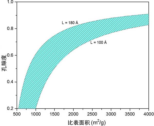 以前提出的活性炭微孔率模型將表面積和孔隙率作為兩個獨立變量處理。通過將石墨烯片的長度限制在100和180之間,并通過改變石墨中石墨烯層的平均數(shù)量,我們計算孔隙率和比表面積之間的關(guān)系。圖2顯示了孔隙率和表面積之間的關(guān)系。