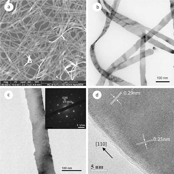 圖1顯示了在活性炭上生長(zhǎng)的銀納米帶的典型電子顯微鏡(EM)圖像。SEM圖像(圖1a)顯示獲得了豐富的線狀產(chǎn)物,具有非常少的準(zhǔn)球形顆粒雜質(zhì)。圖1b是銀納米帶的典型TEM圖像。該圖中所示的納米帶的平均寬度為約45納米。從左側(cè)附近的扭曲納米帶測(cè)量的厚度為約9納米。位于TEM網(wǎng)格上的這種平坦且光滑的納米結(jié)構(gòu)也通過(guò)右側(cè)的莫爾圖案來(lái)證實(shí),其源自具有不同晶體取向的兩個(gè)或三個(gè)納米帶的堆疊。圖1c呈現(xiàn)單個(gè)納米帶的TEM圖像。其選擇區(qū)域電子衍射(SAED)圖案插入右上角,具有六重對(duì)稱性。