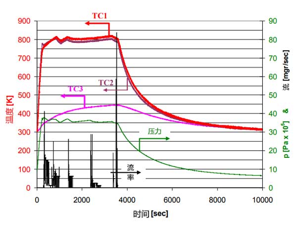 排出壓力約為3.5MPa的實(shí)驗(yàn)結(jié)果如圖4所示。250秒后,加熱功率為500W,中心溫度超過(guò)476℃,而電池底座溫度則為76℃。然而,將電池達(dá)到其穩(wěn)態(tài)溫度分布需要大約60分鐘,其中電池基座中的溫度為166℃;钚蕴康臏囟炔辉试S超過(guò)526℃。 60分鐘,加熱功率逐漸降低,以保持最高溫度低于526℃,壓力高于3.5MPa。由于電池基座的溫升速率隨時(shí)間降低,輸送的氮量也減少了。因此,在15分鐘后結(jié)束放電階段僅從活性炭吸附池釋放4.6g氮。圖4中的冷卻階段持續(xù)約100分鐘,并且如果放電階段在15分鐘后結(jié)束(此時(shí)基礎(chǔ)溫度僅為126℃),則可以減少冷卻階段;钚蕴恐械募訜岷屠鋮s速率以及溫度分布與數(shù)值分析估計(jì)的相似。這表明簡(jiǎn)化的數(shù)值傳熱分析為吸附池中的傳熱提供了令人滿意的估計(jì)。