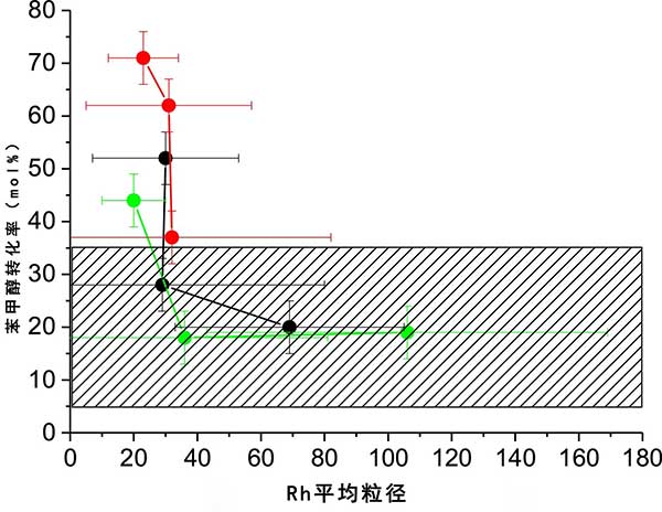 很明顯,這些粒徑范圍非常寬,我們認(rèn)為考慮這樣的大顆粒對氧化反應(yīng)具有活性是不現(xiàn)實的。在其它術(shù)語中,因子或參數(shù)是該預(yù)治療效果有在銠粒子的大小,但另外一個因素或參數(shù)是在銠粒徑變動的影響對催化活性。圖3值得注意的是,對于高于約的顆粒。30-40nm不再觀察到與催化轉(zhuǎn)化的變化或相關(guān)性,表明粒度不再是活性參數(shù)。我們認(rèn)為該值是銠對芐醇氧化的活性的近似上限直徑,或者反過來對該反應(yīng)有活性要求小于約30納米。我們認(rèn)為這個結(jié)論雖然是一個廣泛的估計,但與未來基于這種金屬的催化劑開發(fā)相關(guān)。