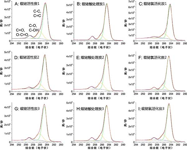在我們的案例中,我們對所有9種活性炭催化劑進(jìn)行了詳細(xì)的X射線光電子能譜分析。但是,我們應(yīng)該注意到,就表面原子組成而言,沒有檢測到信號。我們將此結(jié)果歸因于銠的固有低信號,并且我們的銠中心極其分散在我們的碳基質(zhì)中,反過來非常低的暴露金屬部分用于有意義的檢測,X射線粉末衍射儀分析也證實了這一點(diǎn)。
