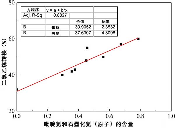 氮摻雜活性炭的活動點如圖3所示,隨著吡啶氮和石墨氮的增加,二氯乙烷轉(zhuǎn)化率呈線性增加,不論氮資源的變化如何,推斷吡啶氮和石墨氮與二氯乙烷的催化脫氯化氫密切相關(guān),是有效的氮原子。