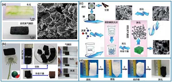 活性炭氣凝膠由納米結(jié)構(gòu)活性炭材料組成,其中孔隙充滿氣體。因為可以結(jié)合有益吸附性質(zhì)和高的熱穩(wěn)定性,并且擁有電子傳導(dǎo)性,和可成為催化劑載體,油或有機溶劑吸附和儲能方面的潛在應(yīng)用;钚蕴繗饽z還有一個特征是它們的超輕質(zhì)。除了高度多孔和輕質(zhì)之外,另一個優(yōu)點是在轉(zhuǎn)化成活性炭氣凝膠后引入導(dǎo)電性的可能性,因此允許在電化學(xué)區(qū)域(例如,電池,超級電容器或?qū)щ姶呋瘎┹d體)中的應(yīng)用。隨著新型活性炭材料的發(fā)展,已經(jīng)生產(chǎn)出具有超低密度和優(yōu)異導(dǎo)電性的石墨烯或基于納米碳管的活性炭氣凝膠作為新興的新型氣凝膠材料,這進一步拓展了氣凝膠材料的應(yīng)用領(lǐng)域。除了高級碳材料能制造氣凝膠外,使用生物質(zhì)做成的活性炭氣凝膠如圖7所示。