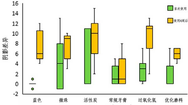 圖2:美白效果由每種牙膏的基線與首次使用后和使用四周后之間的色調(diào)單位差異表示。