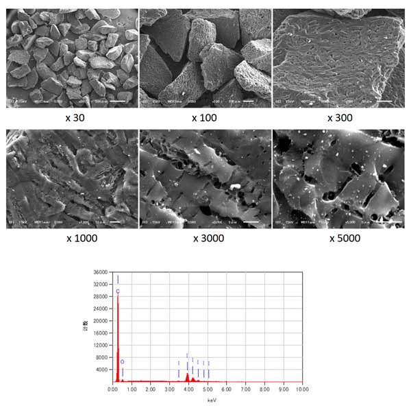 圖1顯示了碘浸漬活性炭的SEM圖像。生產(chǎn)過程不影響活性炭的表面,并且在浸漬過程之前比較碘浸漬活性炭和活性炭沒有觀察到表面差異。EDS結(jié)果顯示顆粒上存在碘,證實了浸漬的成功。