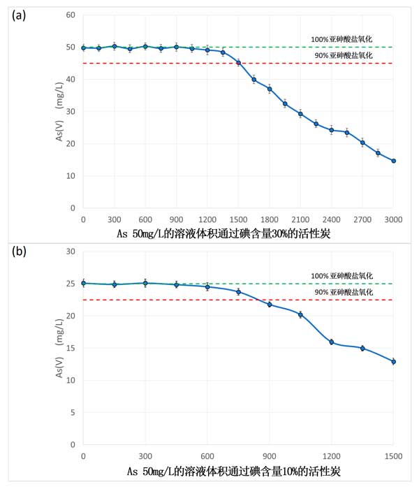 我們的柱實驗可以被認(rèn)為是一種壓力測試,因為亞砷酸鹽的含量遠(yuǎn)遠(yuǎn)高于天然水中常見的濃度。也使用如此高的濃度以不過度延長實驗時間。在基于蒸餾水的實驗中,并且使用碘浸漬活性炭,測得砷的氧化效率大于90%直至1.5L被氧化,并且在對于1cc碘浸漬活性炭,氧化能力為約25mg砷。之后,氧化效率逐漸降低,在2.5L左右下降至低于50%(圖3a)。