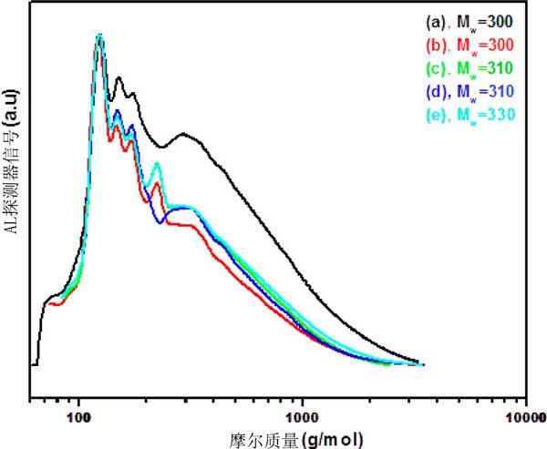 圖2:在400℃下通過(guò)各種活性炭載磷化物獲得的木質(zhì)素油的凝膠滲透色譜圖。