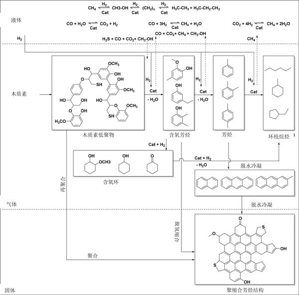 基于木質(zhì)素油的產(chǎn)物產(chǎn)率和組成,提出了一種用于加氫處理的反應(yīng)過(guò)程。木質(zhì)素使用活性炭催化劑和氫氣(圖3)。它涉及在液相和氣相中發(fā)生的許多連續(xù)和平行反應(yīng)。對(duì)低分子量烷基酚類和芳族化合物的所需反應(yīng)涉及通過(guò)裂解鍵來(lái)對(duì)木質(zhì)素進(jìn)行熱和催化解聚(加氫裂化)。最具反應(yīng)性的連接是醚鍵,盡管這些在木質(zhì)素中不是很豐富。活性炭催化劑促進(jìn)解聚反應(yīng),但在不存在活性炭催化劑的情況下的反應(yīng)也產(chǎn)生(有限)量的木質(zhì)素油,表明熱解聚反應(yīng)也起作用。低聚物片段可以進(jìn)一步解聚成烷基酚類形式的低分子量化合物或再聚合(也與已形成的低分子量化合物一起)成更高濃度的結(jié)構(gòu),最終導(dǎo)致燒焦。后一種途徑可能是熱反應(yīng),因此可以通過(guò)使用非;顫姷幕钚蕴看呋瘎﹣(lái)抑制,所述催化劑通過(guò)催化隨后的轉(zhuǎn)化來(lái)減少活性中間體的量。中間低分子量烷基酚類在反應(yīng)條件下不是惰性的,并且可以進(jìn)一步加氫脫氧成芳族化合物和烷烴。