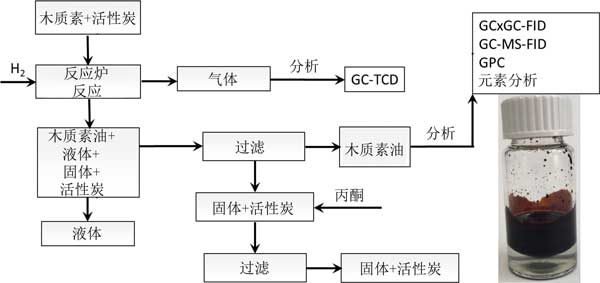 所有活性炭催化加氫處理反應(yīng)均在間歇式高壓釜中進(jìn)行。反應(yīng)器被鋁塊包圍,該鋁塊包含電加熱元件和允許冷卻水流動(dòng)的通道。使用氣體誘導(dǎo)的渦輪機(jī)機(jī)械攪拌反應(yīng)器內(nèi)容物。在線監(jiān)測(cè)反應(yīng)器中的溫度和壓力并記錄在電腦上。加氫處理和后處理程序示意性地顯示在圖1中。最初,向反應(yīng)器中加入木質(zhì)素和活性炭催化劑。隨后,用氫氣沖洗反應(yīng)器以排出空氣并在室溫下加壓至120巴以進(jìn)行泄漏測(cè)試。泄漏測(cè)試后,壓力降至100巴。開(kāi)始攪拌(1200rpm),并以約10℃每分鐘的加熱速率將反應(yīng)器內(nèi)容物加熱至所需溫度(400-500℃)。當(dāng)達(dá)到所需溫度時(shí),將反應(yīng)時(shí)間設(shè)定為零。反應(yīng)完成后,將反應(yīng)器以約10℃每分鐘的速率冷卻至室溫。記錄室溫下的壓力以確定反應(yīng)過(guò)程中產(chǎn)生的氣相組分的量。將產(chǎn)生的氣體收集在氣袋中以確定組成。對(duì)于所有反應(yīng),觀察到兩個(gè)單獨(dú)的液相的清晰形成即即。產(chǎn)品處理程序如圖1所示。反應(yīng)后,將有機(jī)相和水相通過(guò)微過(guò)濾器過(guò)濾并通過(guò)傾析分離。用丙酮徹底洗滌固體并干燥以確定固體產(chǎn)率。
