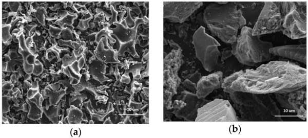 圖1:通過(guò)用(a)氫氧化鉀和(b)磷酸化學(xué)活化活性炭的微觀結(jié)構(gòu),通過(guò)SEM分析估計(jì)。