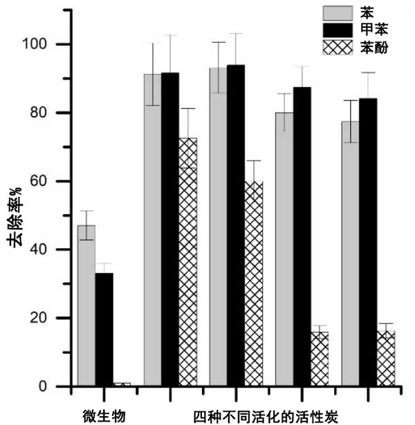 簡(jiǎn)而言之,使用活性炭(60%-93%)和載微生物活性炭(16%-84%)比游離的無(wú)活性炭載體的微生物(1%-47%)更好地去除芳香烴。材料的孔隙率和吸附偶極性有利于吸附。常規(guī)活性炭表現(xiàn)出高度的微孔性,其中可以容納分子量約為100的苯,甲苯和苯酚;钚蕴康姆菢O性特征保證了碳?xì)浠衔锏氖杷,也是非極性的;钚蕴筷(yáng)離子表面有利于芳烴保留,因?yàn)榉辑h(huán)中的π電子與表面陽(yáng)離子靜電連接。使用常規(guī)活性炭和載微生物活性炭的原油去除能力如圖3所示。使用游離的微生物和油-鹽水乳液作為對(duì)照。