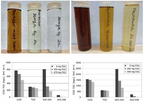 圖2:經(jīng)過(guò)臭氧化處理對(duì)預(yù)處理的水熱碳化用過(guò)的纖維廢水(左)和細(xì)覆蓋廢水(右)的影響。