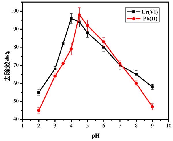 圖2:pH對(duì)活性炭上鉛(II)和鉻(VI)離子吸附的影響。