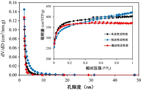 圖1顯示了活性炭纖維的孔徑分布。如圖1所示,活性炭纖維的孔徑在1至20nm之間。同時,幾種活性炭的所有氮吸附/解吸曲線均與IV型吸附等溫線相對應(yīng)。由于活性炭內(nèi)中孔定義為2–50 nm,在未經(jīng)改性和經(jīng)過改性的活性炭是微孔的,但HNO 3改性擴(kuò)大了孔的結(jié)構(gòu)并導(dǎo)致了中孔的結(jié)構(gòu)。因此,活性炭顯示出微孔/中孔結(jié)構(gòu)特征,并且可以用作在水中吸附砷離子的有前途的材料。