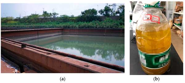 圖1:采樣地點(diǎn)和廢水樣本。(a)污水處理池;(b)未經(jīng)處理的廢水樣品。