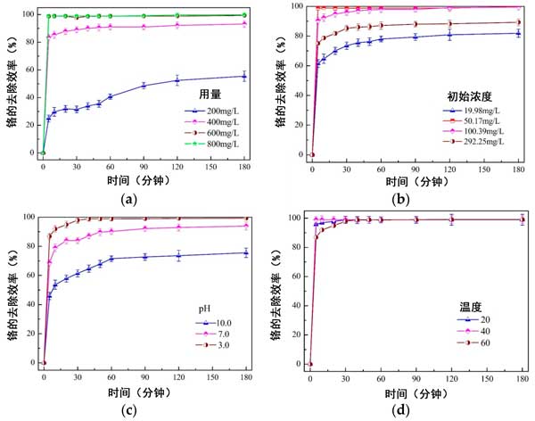 如在示出的圖4中的a,b中,活性炭中的nZVI劑量和初始濃度對(duì)總鉻的去除動(dòng)力學(xué)顯著影響。初始去除率隨著活性炭復(fù)合材料劑量的增加或初始濃度的降低而逐漸增加,因?yàn)樘峁┝俗銐虻膎ZVI活性位與鉻反應(yīng)。