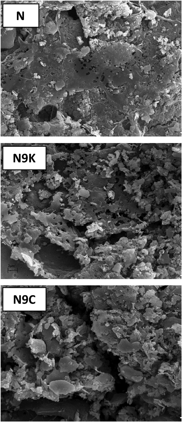 活性炭和經(jīng)改性后獲得的樣品的化學(xué)成分。兩種修飾均導(dǎo)致灰分含量以及結(jié)構(gòu)中特定元素的變化,其中這些變化對N9K樣品而言更大。起始活性炭(N)暴露于碳酸鉀會(huì)導(dǎo)致礦物質(zhì)(灰分)的顯著下降,同時(shí)氫含量下降兩倍(可能是碳結(jié)構(gòu)芳構(gòu)化的結(jié)果)由于活性炭顆粒的表面氧化,增加了氧氣量。還值得注意的是,灰分含量比在CO 2中退火的N9C樣品低了近10倍。大氣層。N9K中的灰分很可能是由于活化后將其用5%的鹽酸溶液洗滌而導(dǎo)致的。圖1所示的SEM圖像也證實(shí)了各個(gè)活性炭的質(zhì)地和形態(tài)多樣性。可以看出,根據(jù)制備程序,樣品在尺寸,形狀以及孔的數(shù)量或排列方面存在顯著差異。特別是在活性炭和N9C樣品中可以觀察到的較亮片段可能是其結(jié)構(gòu)中存在灰分(礦物質(zhì))的結(jié)果。