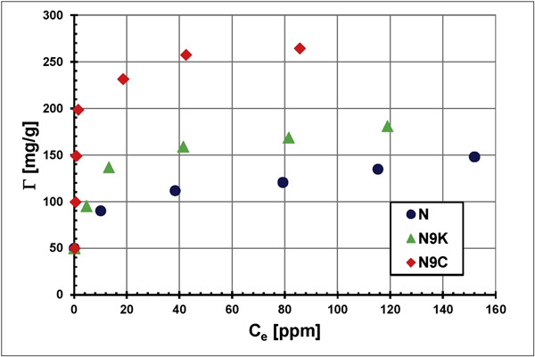 在圖3中比較了初始濃度為100 ppm的活性炭,N9K和N9C表面上初始濃度為100 ppm的聚合物溶液中PAA(Γ)的吸附量。?梢钥闯觯瑢τ谒袡z查的活性炭,觀察到隨著pH升高聚合物吸附明顯減少。這是由于所檢查系統(tǒng)中的靜電條件從有利的吸引條件(在較低的pH值)變?yōu)椴焕呐懦鈼l件(在較高的pH值)而引起的。而且,在更酸性的環(huán)境中,聚合物鏈的盤繞構(gòu)型使得吸附層的堆積更為緊密(高PAA吸附)。在較高的pH值下,PAA鏈發(fā)展的增加導(dǎo)致表面層中吸附的大分子的構(gòu)型更加延長,其特征是聚合物鏈段的堆積密度顯著降低(PAA吸附低)。