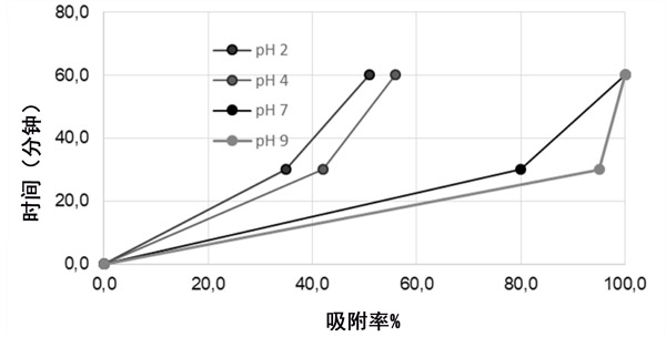研究了pH值對三甲胺在活性炭上吸附的影響。在該過程中,發(fā)生吸附現(xiàn)象的溶液的pH值是非常重要的參數(shù),尤其是在三甲胺為布朗斯臺德堿的情況下。在官能團和吸附劑表面之間產(chǎn)生的靜電荷的大小主要取決于介質(zhì)的pH。在pH值為2、4、7和9的情況下,用0.200g的活性炭測量了在0、30和60分鐘時三甲胺的吸附百分比,結(jié)果總結(jié)在圖3中。