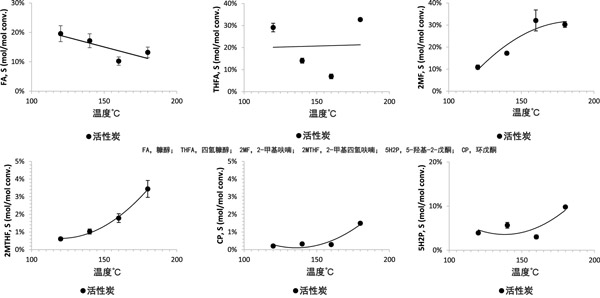 由于使用活性炭整料進行糠醛連續(xù)氫化以合成糠醇,四氫糠醇和環(huán)戊酮的工作很少,我們希望確定溫度和壓力對選擇性和時空產(chǎn)率或轉(zhuǎn)化率的影響。因此,在一組實驗中,采用活性炭催化劑來確定溫度對糠醛氫化的影響。在所有溫度下,活性炭整料的糠醛轉(zhuǎn)化率均高于90%;钚蕴空系母咛挤忾]率是在180°C時達到的(約90%)。升高溫度會降低糠醇的選擇性,并提高除四氫糠醇以外的所有產(chǎn)品的選擇性(圖2)。